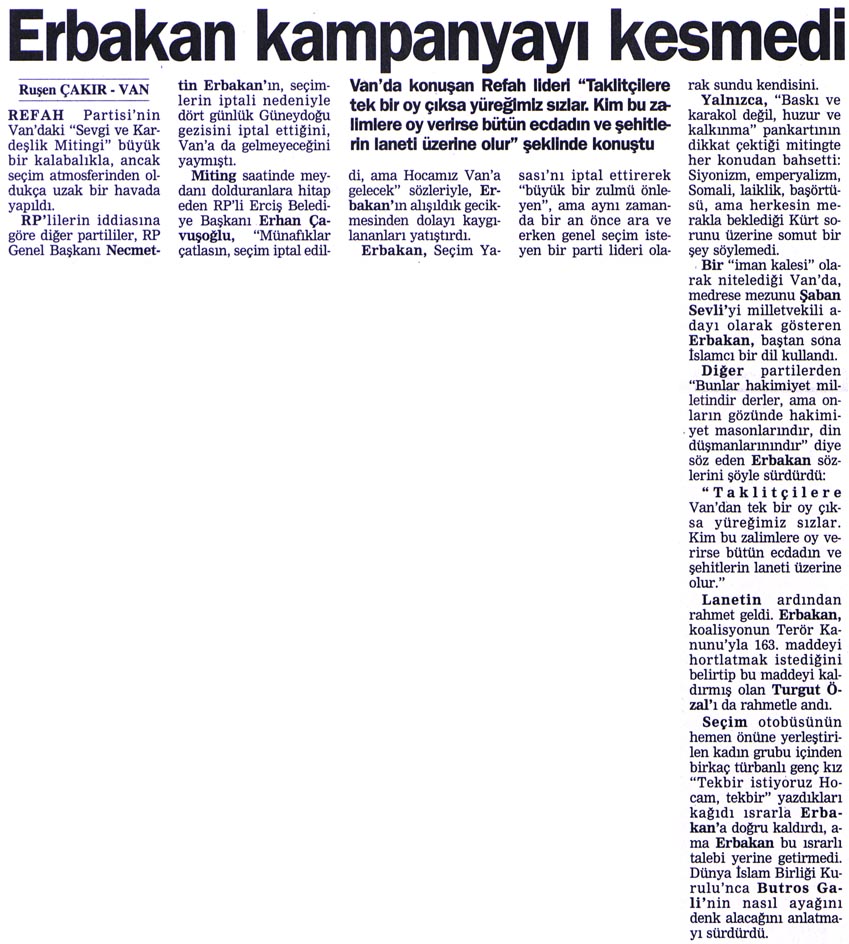 Seçim otobüsünün hemen önüne yerleştirilen kadın grubu içinden birkaç türbanlı genç kız “Tekbir istiyoruz Hocam, tekbir” yazdıkları kâğıdı ısrarla Erbakan’a doğru kaldırdı, ama Erbakan bu ısrarlı talebi yerine getirmedi. Dünya İslam Birliği Kurulu’nca Butros Gali’nin nasıl ayağını denk alacağını anlatmayı sürdürdü.