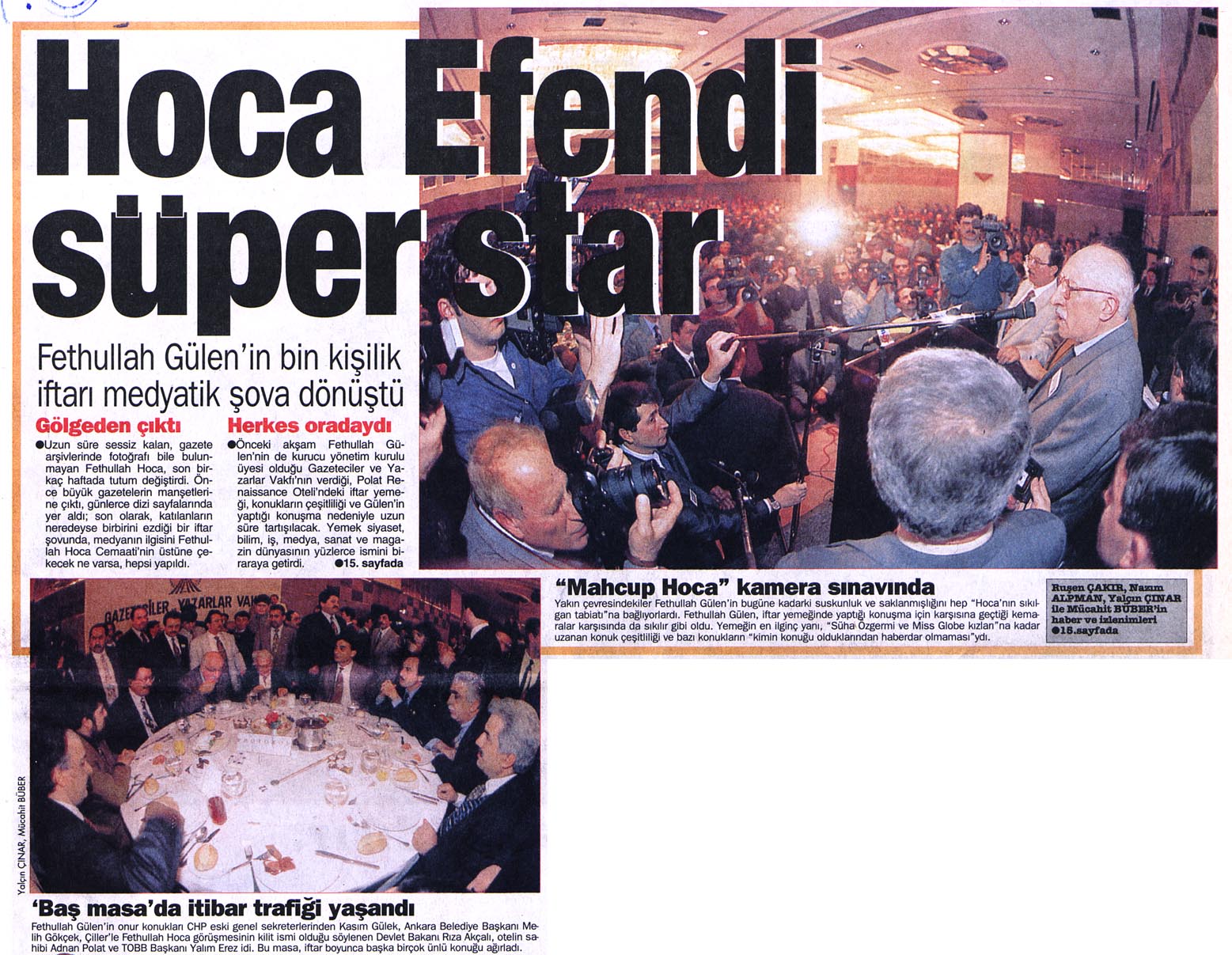 Fethullah Hoca yakın bir zamana kadar medyayla muhatap olmamak için elinden geleni yapmıştı. Ama şimdi o medyanın üstüne üstüne gidiyor. Örneğin iftarda yaptığı konuşmada esas olarak medyaya mesajlar verdi. Gazeteleri, radyoları, televizyonları, toplumun ihtiyacı olduğunu söylediği, “değişik kesimleriyle kaynaşma, bütünleşme, birleşme, uzlaşma ve her hususta konsensus”u tesis etmeye çağırdı. Aynı çağrısını, iftardan sonra özel bir odada sohbet ettiği köşe yazarlarına tekrarladı.