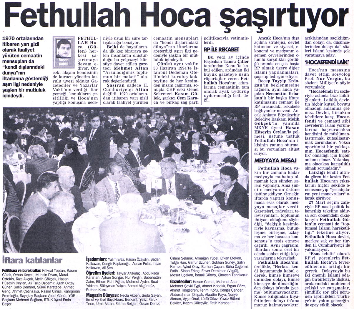 Fethullah Hoca (Gülen) herkesi şaşırtmaya devam ediyoı. Önceki akşam kendisinin de kurucu yönetim kurulu üyesi olduğu Gazeteciler ve Yazarlar Vakfı’nın verdiği iftar yemeği, konukların çeşitliliği ve Hoca’nın yaptığı konuşma nedeniyle uzun bir süre tartışılacağa benziyor.