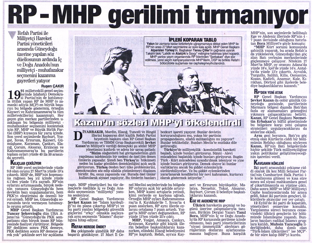 - Refah Partisi ile Milliyetçi Hareket Partisi yöneticileri arasında Güneydoğu üzerine yapılan söz düellosunun ardında İç ve Doğu Anadolu’nun milliyetçi - muhafazakâr seçmenini kazanma gayretleri yatıyor